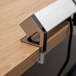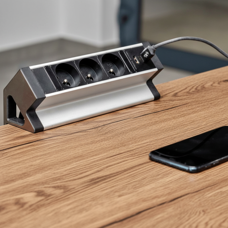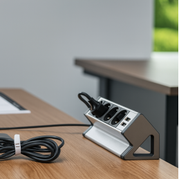 Die Steckdose ist für die einfache Befestigung an der hinteren Tischkante mit einer Stärke von 6 bis 41 mm vorgesehen, ohne dass ein Ausschnitt in der Platte erforderlich ist. Die Montage erfolgt mit den mitgelieferten Halterungen.