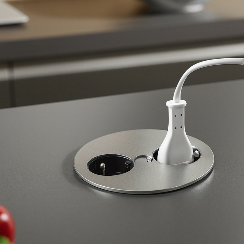 Die TWISTER-Steckdose ist eine moderne und platzsparende Lösung für Küchenschränke, Büroschreibtische oder Arbeitsflächen. Dank ihrer sehr geringen Einbautiefe lässt sie sich problemlos auch über Schubladen integrieren, die sie in keiner Weise stört.