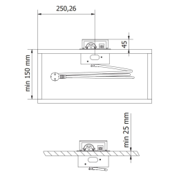 Die Montage erfolgt mit den beiliegenden Schrauben über vier Montageklammern. Für die richtige Platzierung müssen diese leicht (ca. 4 mm) in das Material eingelassen werden, zum Beispiel mit einem Bohrer.