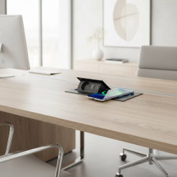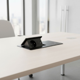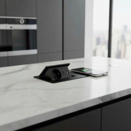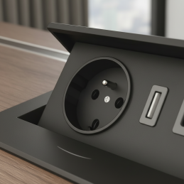 Moderne und ergonomische elektrische Klappsteckdose zur Montage in Arbeitstische, Küchenarbeitsplatten oder Büromöbel. Sie öffnet sich durch einfaches Drücken des Knopfes (Push-to-Open) und schließt sich durch manuelles Zuklappen. Bietet eine praktische und sichere Lösung zum Laden von Elektronik und zum Anschließen von Geräten.