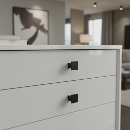 Knopfgriff AXON in elegantem mattschwarzem Design ist die ideale Wahl für ein modernes Interieur. Das minimalistische, eckige Design verleiht den Möbeln ein klares, zeitloses Aussehen und sorgt gleichzeitig für einen bequemen und zuverlässigen Griff. Dank der hochwertigen Verarbeitung eignet sich der Griff für Küchen, Bäder, Garderoben oder Büromöbel.