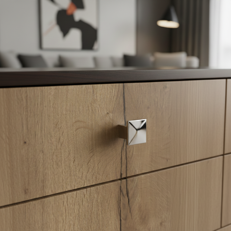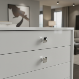 Knopfgriff AXON in glänzender Chromausführung stellt ein elegantes und zeitloses Element dar, das Ihren Möbeln ein luxuriöses Aussehen verleiht. Die eckige Form mit klaren Linien wirkt modern, während die hochglänzende Oberfläche dem Raum einen außergewöhnlichen visuellen Akzent verleiht. Dank der präzisen Verarbeitung und der stabilen Konstruktion eignet er sich für Küchen-, Bad-, Wohn- und Büromöbel.