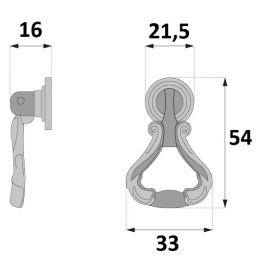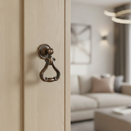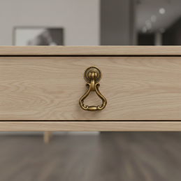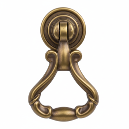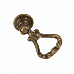 Stilvoller rustikaler Möbelknopf CORTINA in altmessingfarbener Ausführung ist das ideale Accessoire für klassische und rustikale Möbel. Sein reich geformtes Design mit beweglichem unteren Griff verleiht den Möbeln einen authentischen historischen Charakter und Eleganz.