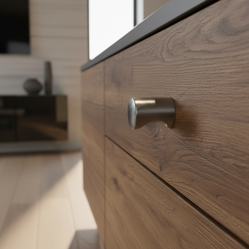 Gebürsteter Edelstahl verleiht dem Knopf ein elegantes, professionelles Aussehen und sorgt gleichzeitig für eine hohe Widerstandsfähigkeit gegen Abnutzung, Feuchtigkeit und Korrosion – was ihn auch für Küchen und Bäder geeignet macht.