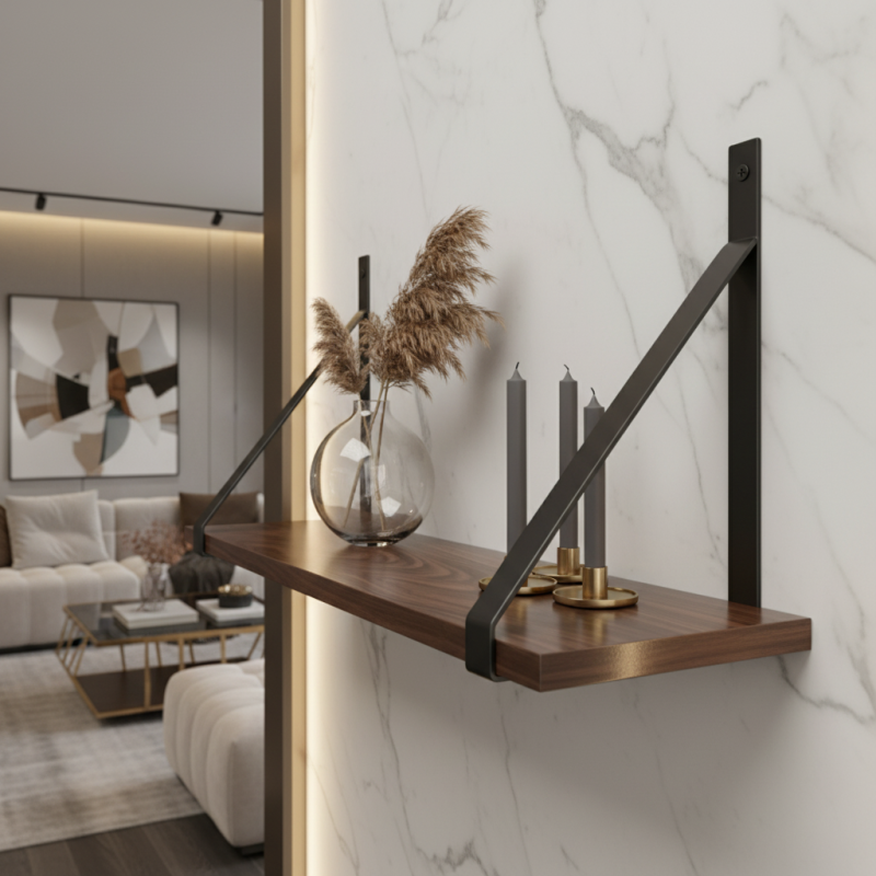 Die elegante und stabile Regalhalterung MESTRE in schwarzer Ausführung ist die ideale Lösung für moderne Innenräume. Das minimalistische Design, ergänzt durch ein schräges Stützelement, schafft eine stabile Konstruktion, die sich für Küchen, Wohnzimmer, Arbeitszimmer oder Flure eignet.