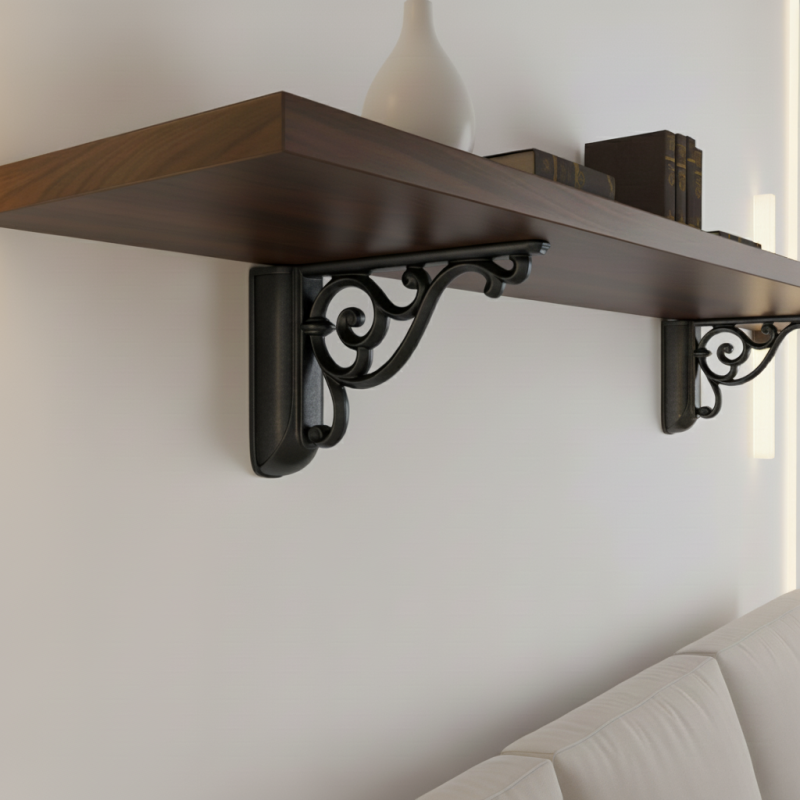 Stilvoller rustikaler Regalträger in eleganter alt-schwarzer Ausführung, der Ihrem Interieur einen einzigartigen Vintage-Charakter verleiht. Das dekorativ geformte Design vereint Robustheit und Ästhetik und ist somit ideal für Küchen, Wohnzimmer, Flure oder den Landhausstil geeignet.