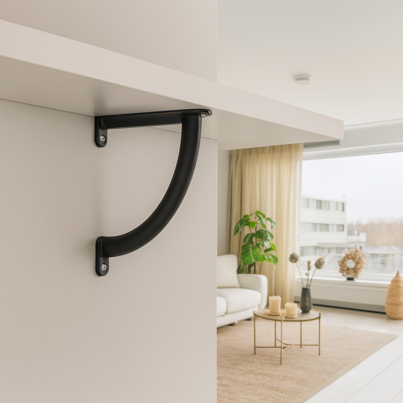 Eleganter und designorientierter Regalhalter mit empfohlener Regalgröße von 200 - 400 mm. Maximale Fachlast ist 100 kg. Die Abmessungen des Halters sind auf den Bildern zu sehen.