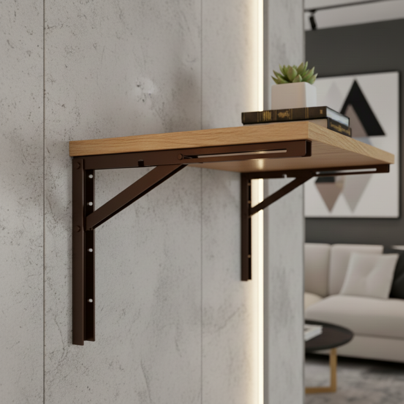 Universelle klappbare Konsole, ideal für Regale, Klapptische, Arbeitsplatten oder Bartheken. Die robuste Stahlkonstruktion in elegantem dunkelbraun sorgt für hohe Festigkeit, lange Lebensdauer und ein attraktives Aussehen, das sowohl zu modernen als auch zu traditionellen Innenräumen passt.