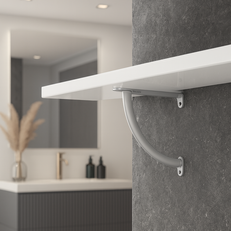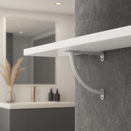 Eleganter und designorientierter Regalhalter mit empfohlener Regalgröße von 200 - 600 mm. Maximale Fachlast ist 150 kg. Die Abmessungen des Halters sind auf den Bildern dargestellt.