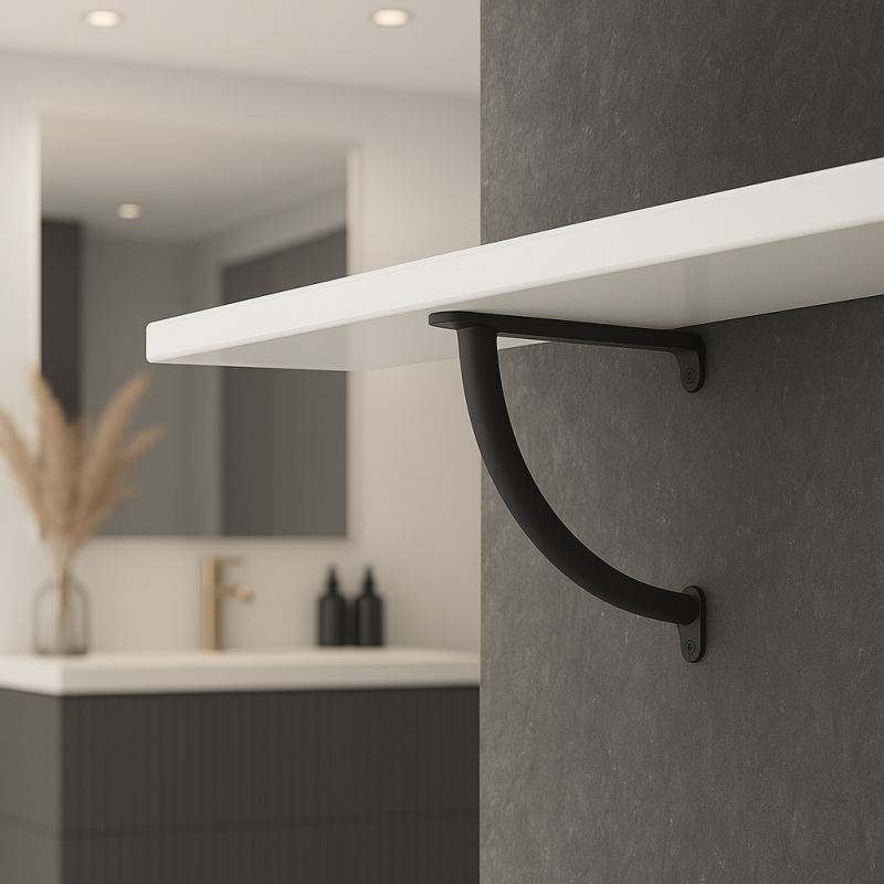 Eleganter und designorientierter Regalhalter mit empfohlener Regalgröße von 200 - 600 mm. Maximale Fachlast ist 150 kg. Die Abmessungen des Halters sind auf den Bildern dargestellt.