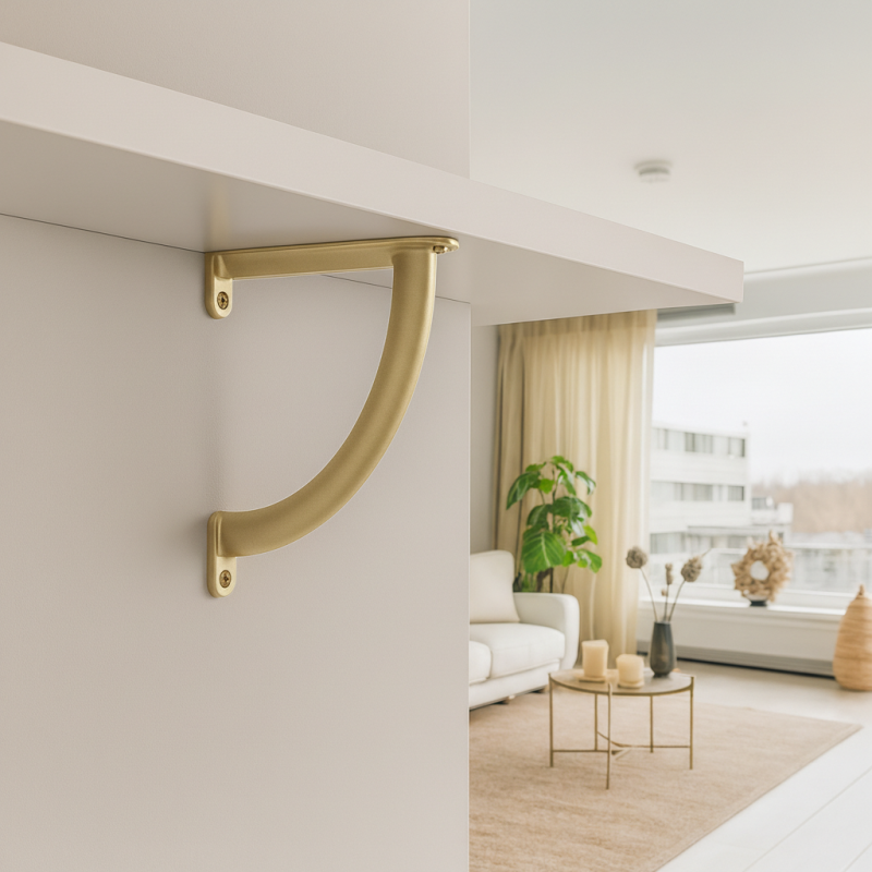 Eleganter und designorientierter Regalträger in luxuriöser goldener Ausführung, der dem Interieur ein anspruchsvolles und modernes Aussehen verleiht. Dank der stabilen Metallkonstruktion eignet er sich nicht nur als ästhetisches Element, sondern auch als zuverlässige Stütze für ein Regal mit höherer Belastung.