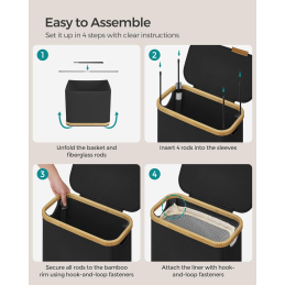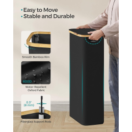 Der Wäschekorb ist aus hochwertigem, dickem 600D Oxford-Gewebe gefertigt, das wasser- und reißfest ist und sich gleichzeitig leicht reinigen lässt. Die innere Struktur wird von Glasfaserstäben gestützt, die Stabilität und Langlebigkeit bei regelmäßiger Nutzung gewährleisten. Dieser Korb ist so konzipiert, dass er Ihnen viele Jahre treu dient.