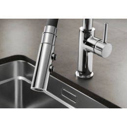 Blanco Catris-S Flexo vereint klassische Linien mit modernem halbprofessionellem Look und Funktionalität. Der flexible schwarze Silikonschlauch ermöglicht maximale Bewegungsfreiheit, während die Doppelfunktion-Brause perfekten Komfort für die tägliche Küchenarbeit bietet.