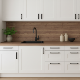 Verleihen Sie Ihrer Küche praktischen Schutz und ein elegantes Aussehen mit unserem Küchenspritzschutz aus hochwertiger Spanplatte, beschichtet mit widerstandsfähigem Laminat. Dieses Material zeichnet sich durch eine hohe Widerstandsfähigkeit gegen Beschädigungen, mechanische Belastung und erhöhte Temperaturen aus, was eine lange Lebensdauer auch bei täglichem Gebrauch garantiert.