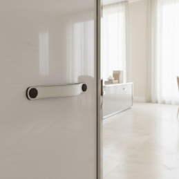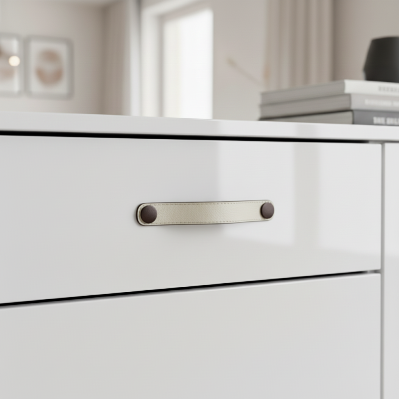 Stilvoller Ledergriff CASE in weißer Ausführung ist ein elegantes Accessoire für moderne sowie klassische Möbel. Echtes Leder mit feiner Textur verleiht dem Interieur ein luxuriöses und sauberes Aussehen. Kontrastierende dunkle Metallabdeckungen schaffen ein attraktives Designdetail.
