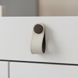 Der elegante Lederknopf CASE in Weiß ist ein modernes und zugleich dezentes Accessoire, das sich für verschiedene Möbeltypen eignet. Er kombiniert echtes Leder mit einem hochwertigen Metallelement in dunkler Ausführung, das einen schönen Kontrast schafft. Die dekorative Naht verleiht dem Griff einen handwerklichen und zeitlosen Charakter.