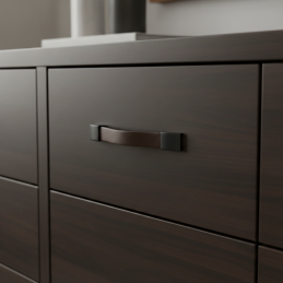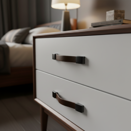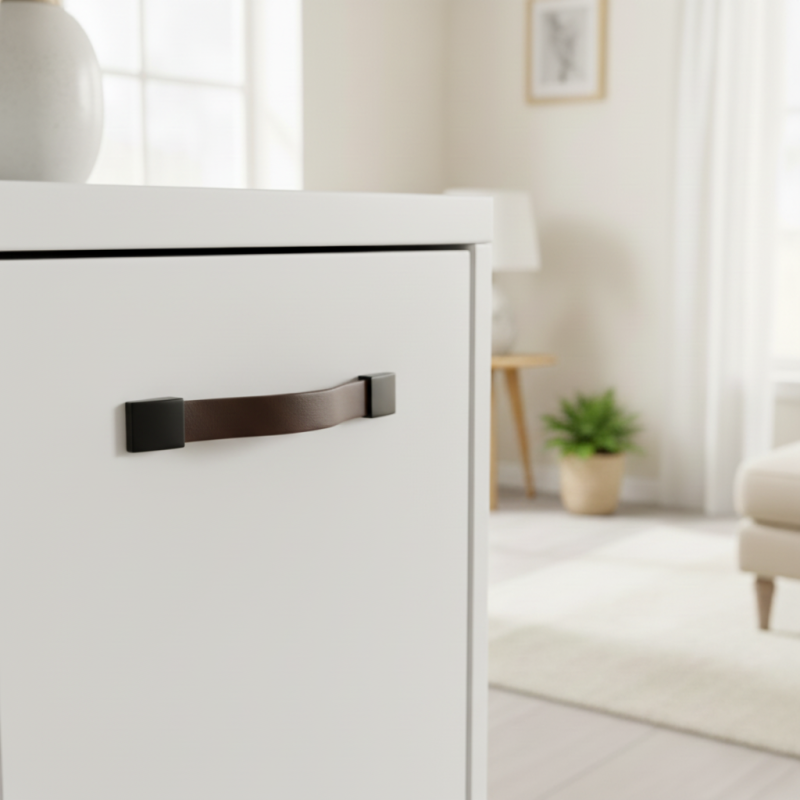 Eleganter Ledergriff, der echtes Rindsleder in brauner Ausführung mit schwarzen Metallenden verbindet. Dank des gebogenen Profils liegt er angenehm in der Hand und verleiht den Möbeln ein modernes, zeitloses Aussehen.