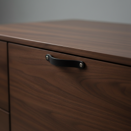Exklusiver Ledergriff aus echtem schwarzen Leder in Kombination mit einer eleganten matten Aluminium-Endkappe. Dank seiner modernen Form und der hochwertigen Handarbeit verleiht er den Möbeln ein Premium-Aussehen. Schwarzes Leder wirkt zeitlos, luxuriös und ist zudem sehr widerstandsfähig bei täglichem Gebrauch.