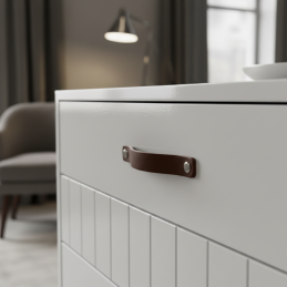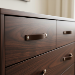Eleganter Ledergriff aus echtem Rindsleder im Farbton dunkelbraun, ideal für moderne, industrielle sowie klassische Möbel. Das Modell DOLCE hat gerade Enden (im Gegensatz zum abgerundeten Modell DOLCE OVAL), was ihm ein klares und minimalistisches Aussehen verleiht.