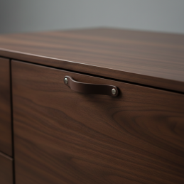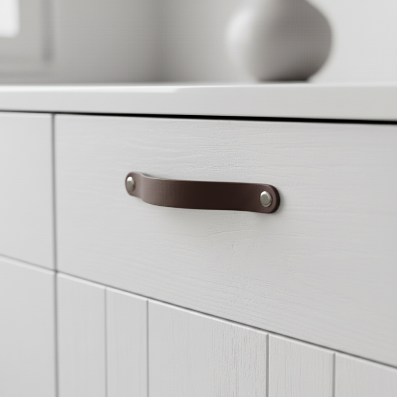 Exklusive Griff aus echtem Leder in elegantem dunkelbraunen Design, ergänzt durch eine matte Aluminium-Endkappe. Wirkt luxuriös, zeitlos und verleiht den Möbeln ein warmes Designdetail. Dank der Flexibilität des Leders ist der Griff angenehm zu benutzen und zugleich sehr vielseitig.
