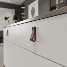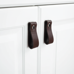Eleganter Ledergriff DOLCE Mini im dunkelbraunen Farbton verleiht Möbeln ein raffiniertes und natürliches Aussehen. Echtes Leder mit feiner Textur wirkt luxuriös und bewahrt dabei ein minimalistisches und zeitloses Design. Passt perfekt in moderne, natürliche sowie industrielle Interieurs.