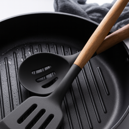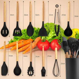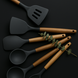 Gönnen Sie sich eine praktische und stilvolle Lösung mit diesem exklusiven 11-teiligen Küchenutensilien-Set, das modernes Design in Schwarz mit der Eleganz von Naturholz vereint. Das Set ist so konzipiert, dass es den täglichen Koch-, Back- und Zubereitungsanforderungen standhält und gleichzeitig Ihre Kücheneinrichtung ästhetisch ergänzt.