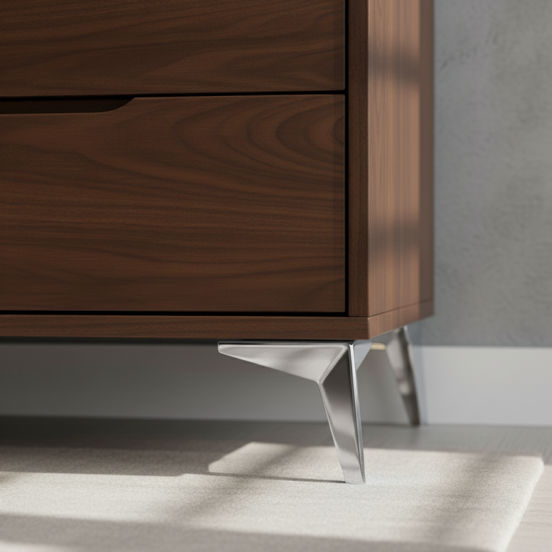 Seine geometrische, leicht abgewinkelte Form erzeugt einen modernen visuellen Effekt und sorgt gleichzeitig für einen stabilen und festen Halt. Der LANIA-Fuß eignet sich für Kommoden, Schränke, TV-Tische, Bänke oder Designermöbel im modernen, minimalistischen oder Glamour-Stil. Er lässt sich hervorragend mit hellen und dunklen Oberflächen, lackierten Möbeln oder Glas kombinieren.