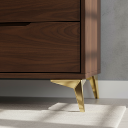 Das Möbelbein LANIA in glänzender Goldausführung ist ein markantes Designelement, das Möbeln einen luxuriösen und modernen Charakter verleiht. Sein elegantes, geometrisch geformtes Design wirkt leicht und luftig, sorgt aber gleichzeitig für einen stabilen und festen Halt. Die glänzende goldene Oberfläche setzt einen hochwertigen Akzent, der auf dunklem Holz, matten Oberflächen und auch auf hellen Dekoren wunderschön zur Geltung kommt.