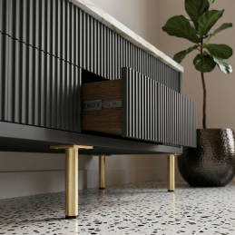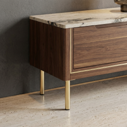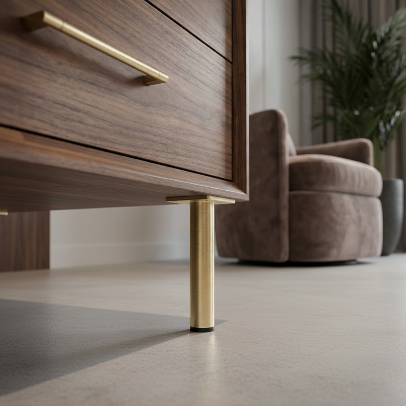Der Fuß LEONOR in gebürsteter Goldausführung verleiht den Möbeln ein modernes und luxuriöses Aussehen und sorgt gleichzeitig für einen stabilen Halt ohne Beschädigung des Bodens.