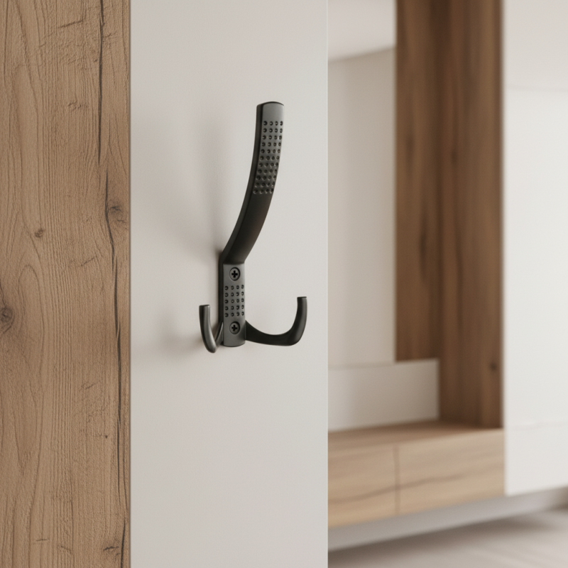 Robuster und eleganter Möbelhaken mit zwei Haken, entworfen für das bequeme Aufhängen auch schwererer Kleidungsstücke. Dank der modernen mattschwarzen Oberflächenbehandlung wirkt er stilvoll und lässt sich einfach mit verschiedenen Möbeln und Beschlägen kombinieren. Ideal für Flure, Garderoben und gewerbliche Räume.