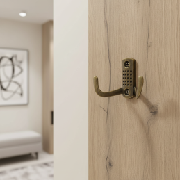 Stilvoller Möbelhaken mit zwei Haken, der dank der Oberflächenbehandlung Messing-Patina dem Interieur ein elegantes, leicht Vintage-Aussehen verleiht. Ideal für klassische und rustikale Räume, aber auch als kontrastierendes Element in modernen Möbeln.
