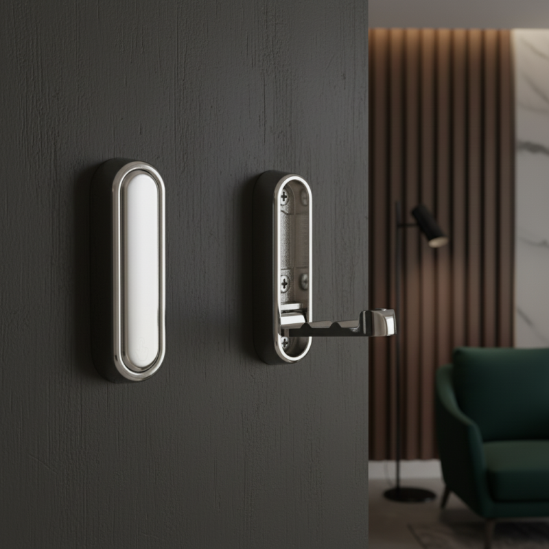 Einfacher, frontmontierter Aufhänger mit einer Höhe von 74 mm und einer Breite von 24 mm. Befestigungsschrauben sind im Lieferumfang enthalten. Der Aufhänger schwenkt einfach durch Drücken aus. Die Aufhängung ist oberflächenmontiert und muss nicht in Möbel oder Material eingefräst werden.