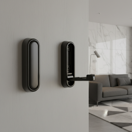 Einfacher, frontmontierter Aufhänger mit einer Höhe von 74 mm und einer Breite von 24 mm. Befestigungsschrauben sind im Lieferumfang enthalten. Der Aufhänger schwenkt einfach durch Drücken aus. Die Aufhängung ist oberflächenmontiert und muss nicht in Möbel oder Material eingefräst werden.