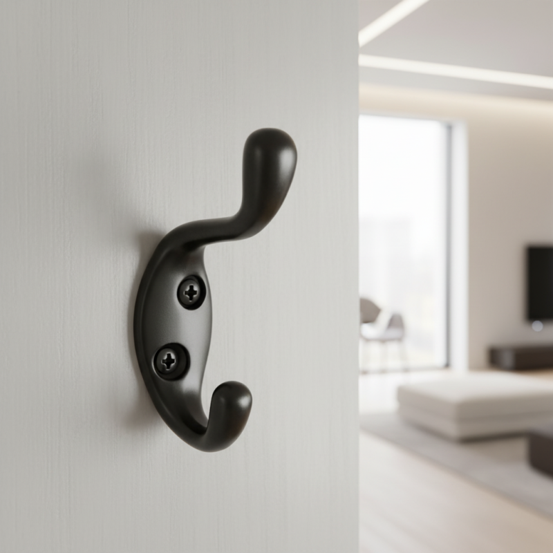 Moderner und eleganter Kleiderhaken LARRA L in mattem Schwarz ist die ideale Ergänzung für Flur, Bad, Küche oder Büro. Dank seiner zeitlosen Form und universellen Ausführung bietet er praktische Nutzung und wirkt zugleich ästhetisch und minimalistisch.