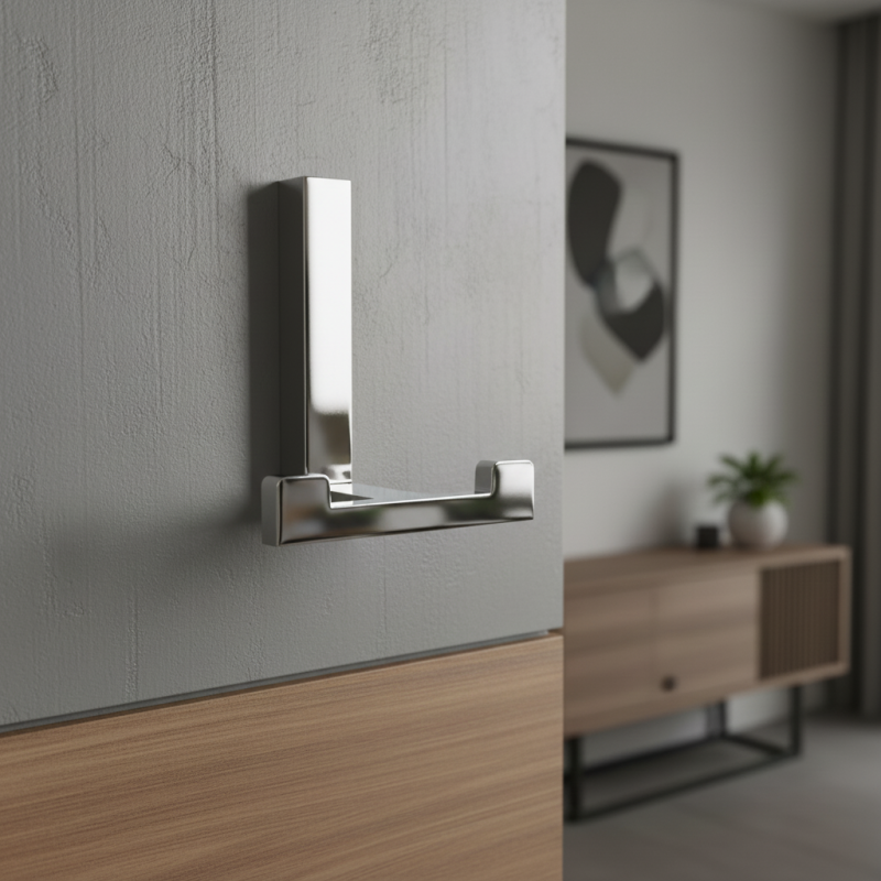 Luxuriöser Kleiderhaken NEXT DUO in der Ausführung glänzendes Chrom ist eine elegante Ergänzung der modernen Kollektion NEXT, die verschiedene Arten von Kleiderhaken im einheitlichen minimalistischen Design anbietet.