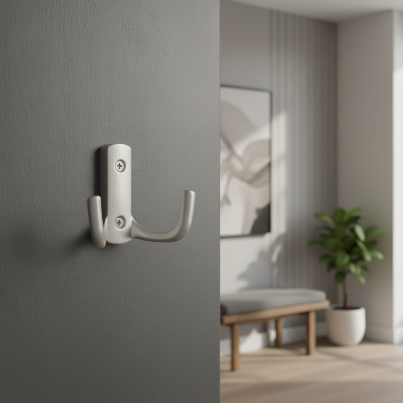 Seine kompakten Maße und der Doppelhaken ermöglichen das bequeme Ablegen von Kleidung, Handtüchern, Taschen oder kleineren Accessoires, wobei er kaum Platz einnimmt.