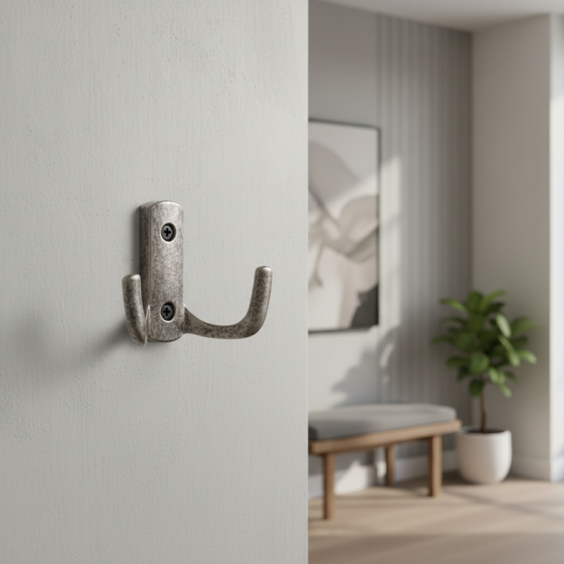 Eleganter VESNA Mini Kleiderhaken in der Oberfläche Alt-Silber ist ein stilvolles Accessoire für Innenräume, die modernes Design mit einem Hauch von Historie oder Industrie verbinden.
