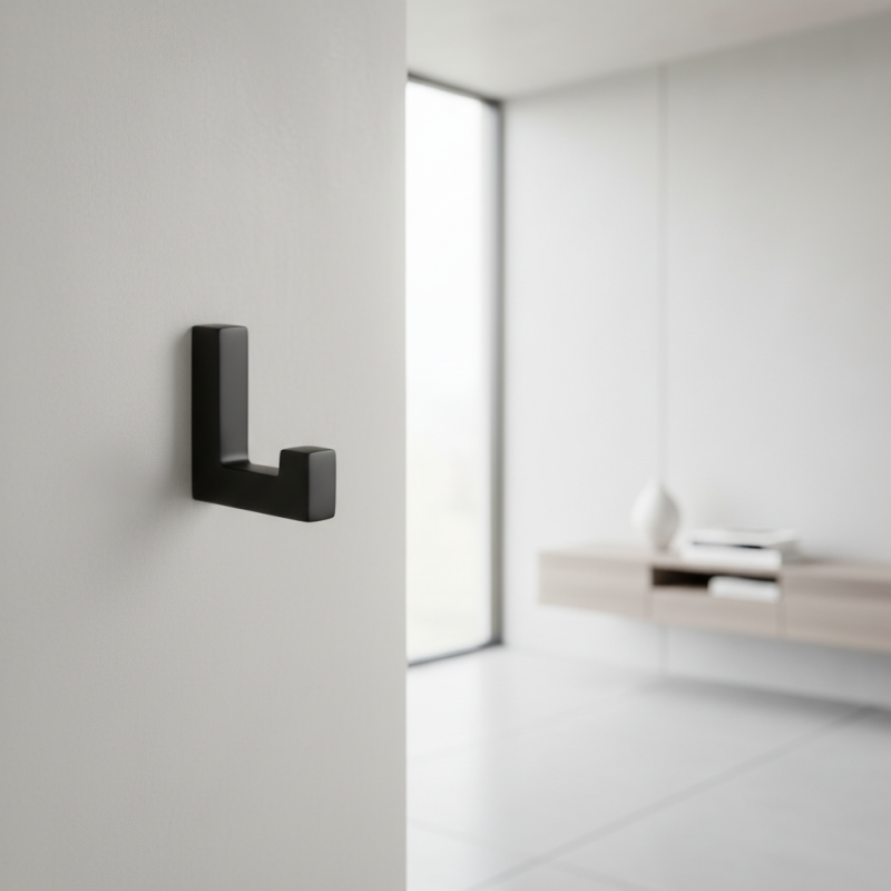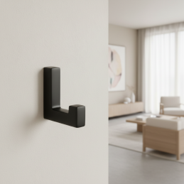 Der moderne und minimalistische MAXA-Kleiderhaken in schwarzer, matter Ausführung ist das ideale Accessoire für den Flur, das Badezimmer, die Garderobe oder das Büro. Sein schlichtes, eckiges Design wirkt elegant und zeitlos, wodurch er sich leicht mit modernen sowie industriellen Interieurs kombinieren lässt.