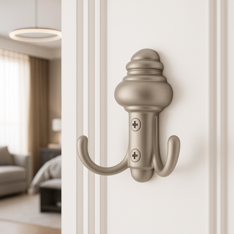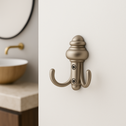 Eleganter Doppelhaken in satinierter Ausführung, der klassisches Design mit modernem Aussehen verbindet. Er ist ideal für den Flur, das Badezimmer, Schlafzimmer oder die Garderobe. Dank seiner abgerundeten Form wirkt er dezent und bietet gleichzeitig ausreichend Platz zum Aufhängen mehrerer Kleidungsstücke oder Accessoires.