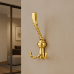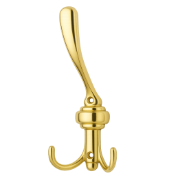 Eleganter dreifacharmiger Kleiderhaken in glänzender Goldoptik, der klassische Form mit luxuriösem Aussehen verbindet. Dank seiner glänzenden Oberfläche und dem ausgefeilten Design wirkt er repräsentativ und verleiht dem Interieur einen Hauch von Eleganz. Ideal für Flur, Badezimmer, Schlafzimmer oder Büro.