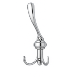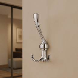 Eleganter dreifacharmiger Kleiderhaken in glänzender Chromausführung, der klassische Form mit luxuriösem Aussehen verbindet. Dank seiner glänzenden Oberfläche und dem ausgefeilten Design wirkt er repräsentativ und verleiht dem Interieur einen Hauch von Eleganz. Ideal für Flur, Badezimmer, Schlafzimmer oder Büro.