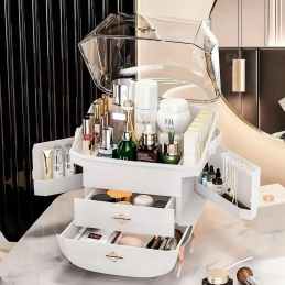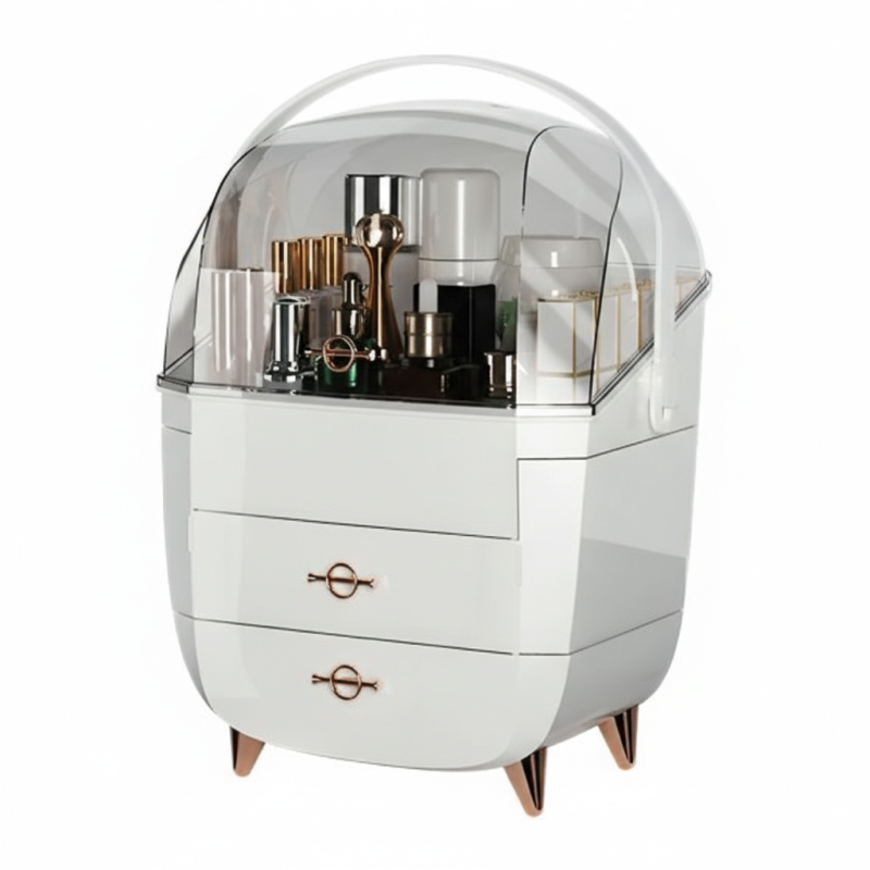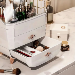 Der Organizer bietet große Aufbewahrungskapazität dank geräumiger Schubladen und großem oberen Stauraum mit transparentem Schutzdeckel, der Kosmetik vor Staub schützt und gleichzeitig einen schnellen und einfachen Überblick über die aufbewahrten Produkte ermöglicht. Parfüms, Cremes, Balsame, Make-up und Hautpflege finden problemlos Platz.