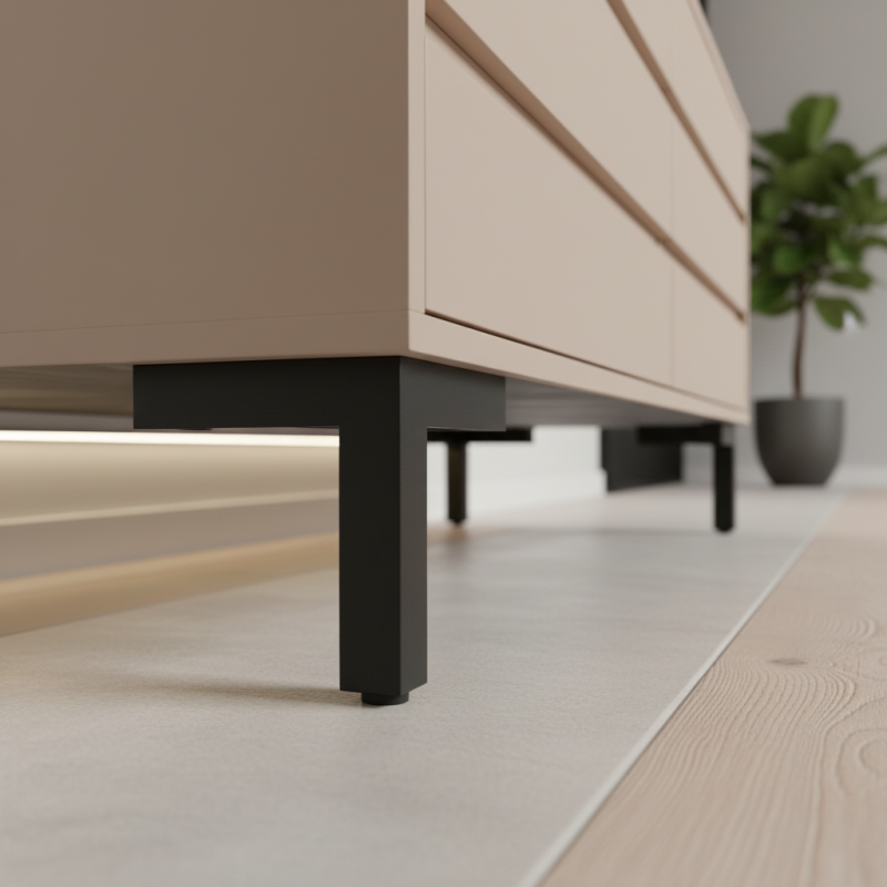 Modernes Möbelfuß ANGEL in der Ausführung schwarz matt ist die ideale Lösung für Kommoden, Schränke, Nachttische oder andere Möbelstücke, denen Sie eine stabile und ästhetische Basis verleihen möchten.