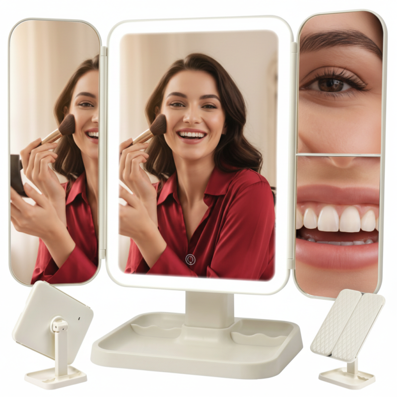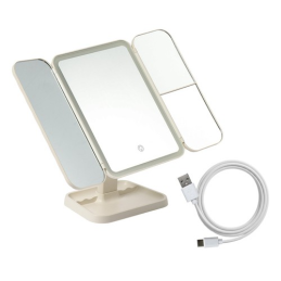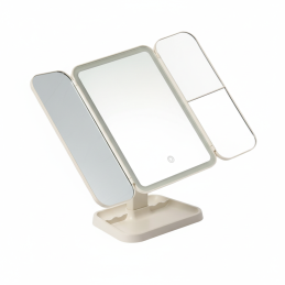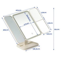 Der elegante Kosmetikspiegel TREND mit LED-Beleuchtung verwandelt Ihren Schminktisch in ein kleines, heimisches Kosmetikstudio. Die dreiteilige, ausklappbare Ausführung mit zentralem Spiegel und seitlichen Flügeln ermöglicht bequemes Schminken, Hautpflege und Frisurstyling aus mehreren Blickwinkeln. Der praktische integrierte Organizer bietet Platz zur Aufbewahrung von Kosmetik und kleinen Accessoires.