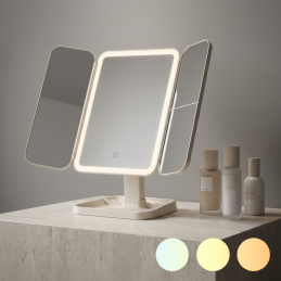 Der Spiegel ist mit LED-Beleuchtung mit einstellbarer Farbtemperatur ausgestattet, wodurch er auch für Räume mit wenig Tageslicht ideal ist. Der rechte Seitenspiegel bietet 2× und 3× Vergrößerung, was Sie bei präzisen Details wie Augen-Make-up oder Augenbrauenstyling zu schätzen wissen werden.