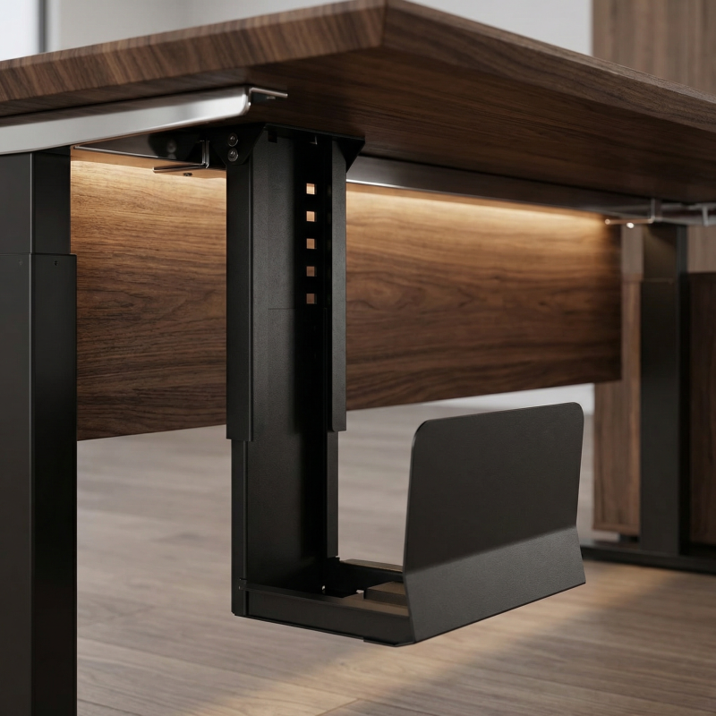 Die praktische und stabile Computerhalterung HOLDER ist für die Montage unter dem Schreibtisch vorgesehen, wo sie eine sichere Aufbewahrung des PC-Gehäuses gewährleistet und gleichzeitig Platz auf dem Boden spart. Durch die Montage unter der Tischplatte ist der Computer vor Staub, Stößen und mechanischen Beschädigungen geschützt.