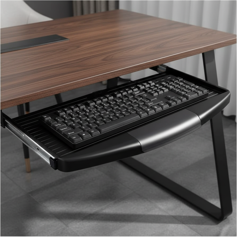 Die praktische und ergonomische Tastaturauszug in schwarzer Ausführung ist die ideale Lösung für Büro- und Heimarbeitsplätze. Er ermöglicht das bequeme Herausziehen der Tastatur unter die Arbeitsplatte, spart dadurch Platz auf dem Tisch und verbessert die Ergonomie bei der Arbeit.