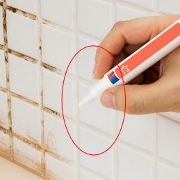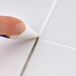 3. Vorsichtig auf die Fugen auftragen und die Farbe, die auf die Fliese gelangt, sofort abwischen.