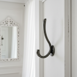 Eleganter Möbelhaken ARLES in der Oberflächenbehandlung antik silber ist das ideale Accessoire für rustikale, Vintage-, industrielle sowie klassische Interieurs. Die feine Profilierung und die hochwertige Metallausführung verleihen ihm ein edles, leicht „abgenutztes“ Aussehen, das wunderbar mit Massivholzmöbeln und modernen Türen mit antikem Akzent harmoniert.
