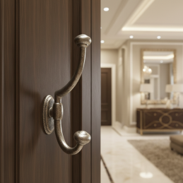 Der Haken ist für die Rückmontage in Möbel oder Möbelwände vorgesehen, wodurch er sauber und ästhetisch ohne sichtbare Befestigungselemente wirkt. Die hochwertige Metallverarbeitung sorgt für hohe Festigkeit, Stabilität und Langlebigkeit auch bei täglichem Gebrauch.
